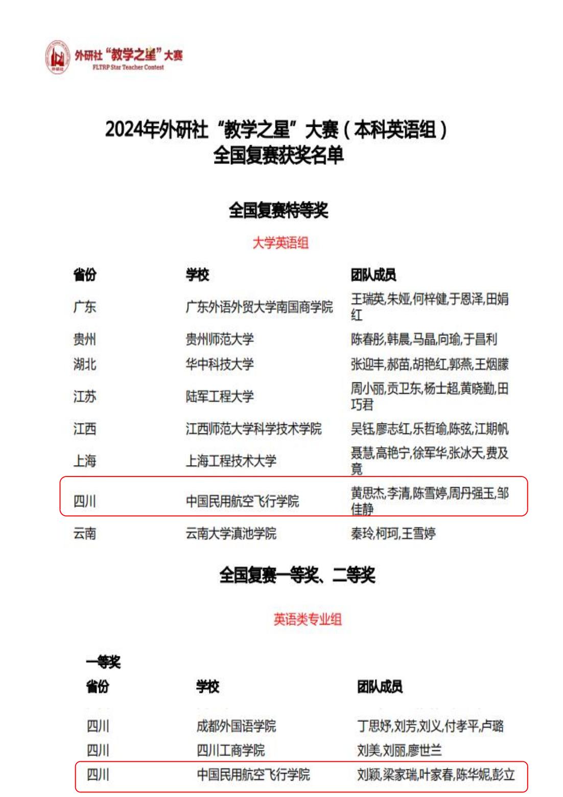 6月20日晚,2024年外研社“教学之星”大赛主题为“外语教材的有效使用:数智融合,创新育人”全国赛晋级名单及获奖名单正式公布。经全国各院校选拔推荐,组委会共收到本科英语组全国复赛参赛材料638份,其中大学英语组321份、英语类专业组168份、“理解当代中国”组149份。我校sjb世俱杯官方网站的两支教师团队,大学英语组黄思杰老师、李清老师(团队成员陈雪婷、周丹强玉、邹佳静)凭借出彩的课程设计、扎实的授课功底荣获外研社“教学之星”全国复赛特等奖,顺利晋级国赛,英语类专业组刘颖老师、梁家瑞老师(团队成员叶家春、陈华妮、彭立)也获得了全国复赛一等奖的优秀成绩。