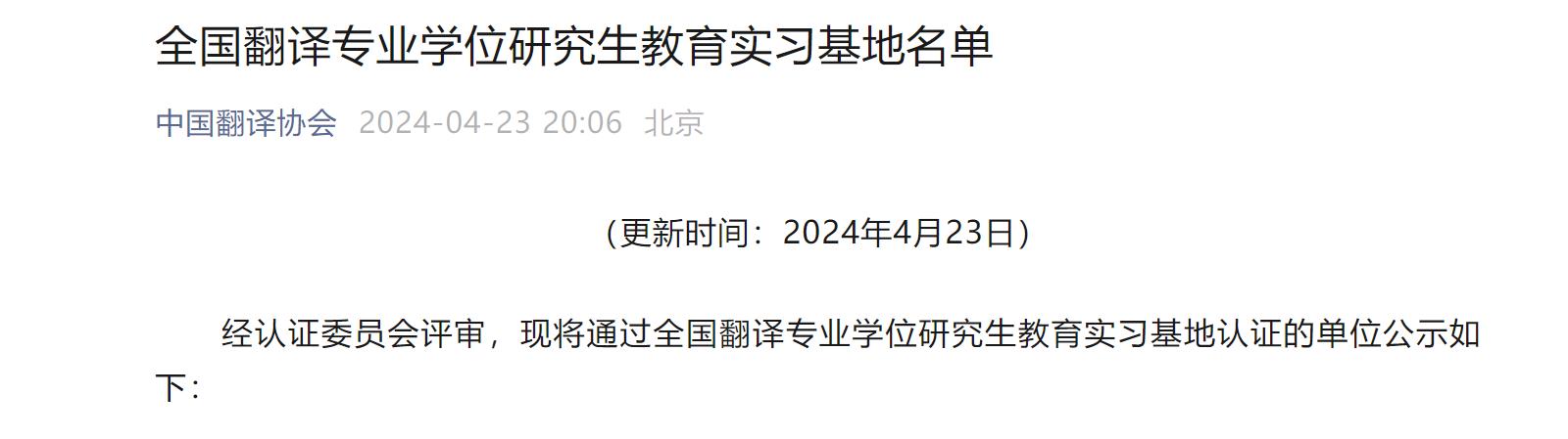 近日,中国翻译协会公布了最新一期全国翻译专业学位研究生教育实习基地名单,sjb世俱杯官方网站翻译硕士点在众多申报单位中脱颖而出,成功通过认证。