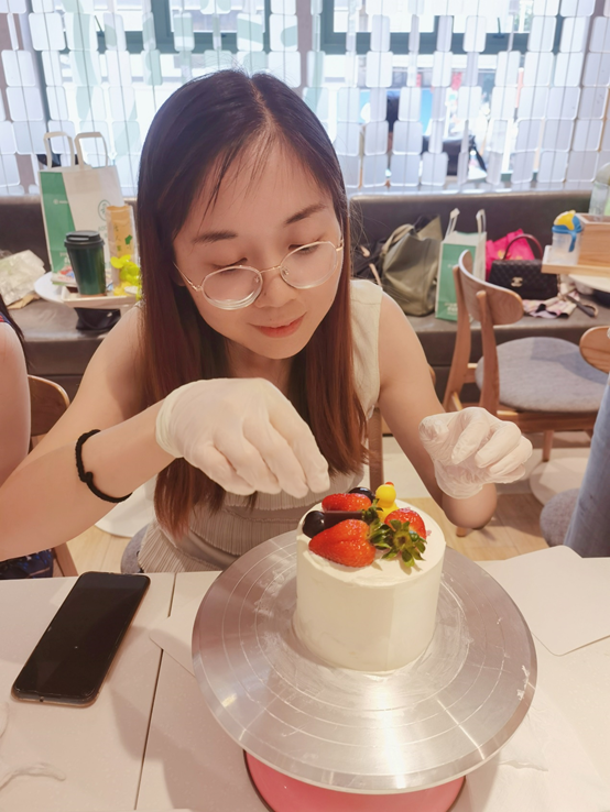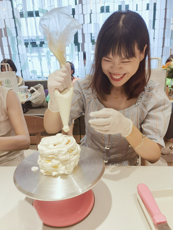 活动中,烘焙师首先为大家讲解了蛋糕制作的所需材料和基本操作流程,分享了蛋糕种类、奶油选择、储存等相关知识,紧接着,蛋糕DIY正式开始!老师们和孩子们在烘焙师的指导下,亲身体验,热情高涨,气氛热烈,活动现场弥漫着诱人的奶油香气。可口的水果、醇香的巧克力、五彩的糖果,加上阵阵的欢声笑语,气氛十分温馨。大家拿起抹刀,将一层层的奶油涂抹均匀地涂抹在海绵蛋糕胚上,在活动中体会着自己动手制作美食的快乐,享受着欢乐的烘焙时光,个个脸上洋溢着灿烂的笑容,在烘焙中感受幸福的味道。