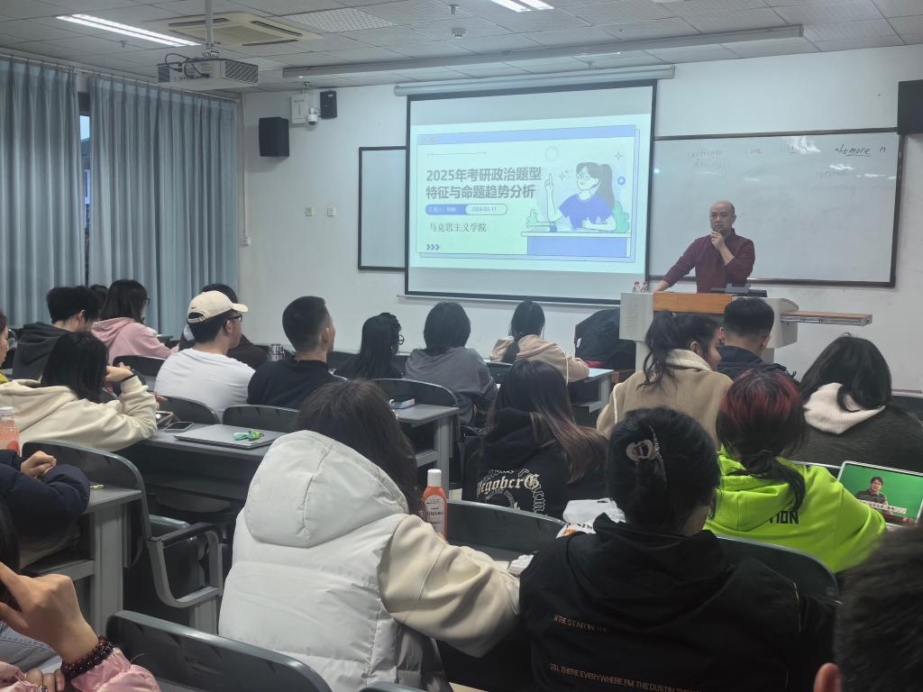 为扎实做好我院学生考研指导工作,帮助学生精准把握考研政治命题特点,sjb世俱杯官方网站于3月11日晚7点在5教416举办了主题为“2025年考研政治题型特征与命题分析趋势分析”的讲座。此次讲座由马克思主义学院思想政治教研室主任帅刚副教授主讲,sjb世俱杯官方网站团学办副主任叶奇奇主持,2021级辅导员伍家媛与2021级、2022级、2023级学生参与了本次讲座。
